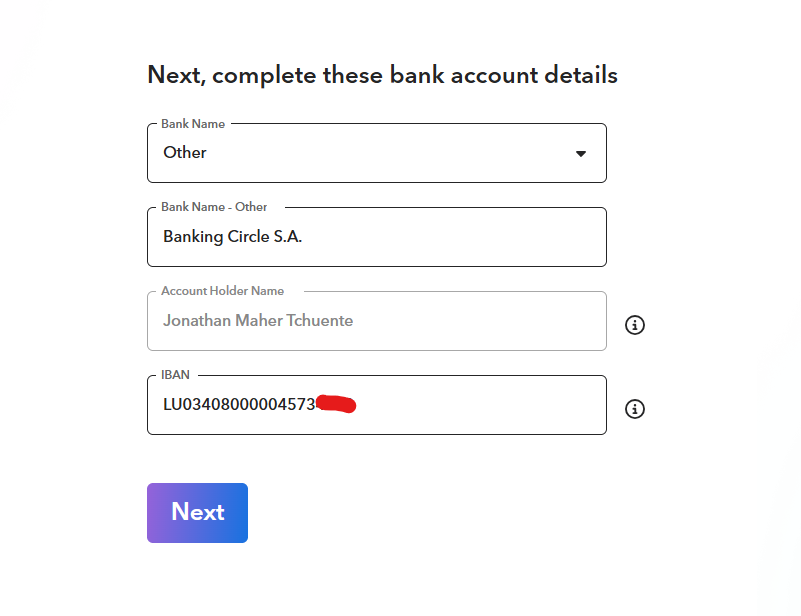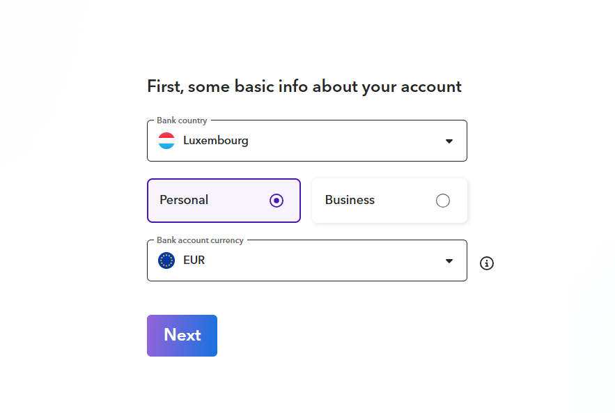 Si vous avez choisi un compte Suprapay en EUR, sélectionnez Luxembourg comme pays de la banque.